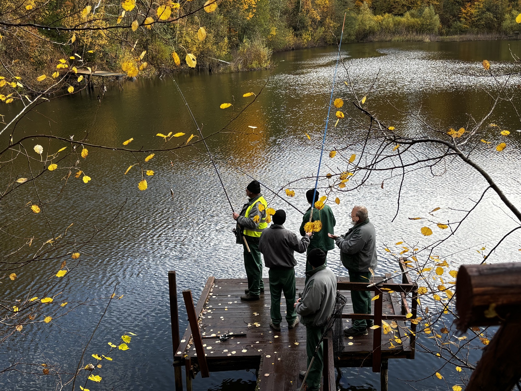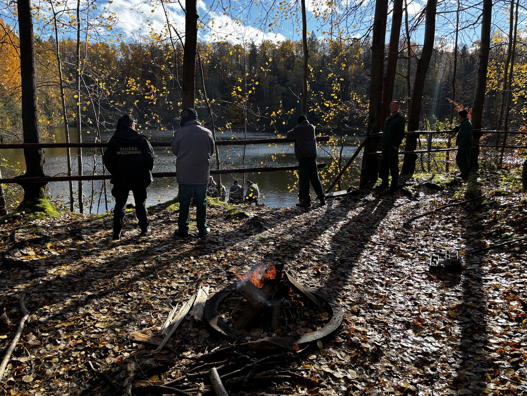 Finałem wycieczki było dotarcie do zakładowego wyrobiska wodnego, gdzie uczestnicy mogli oddać się wędkarstwu – zajęciu sprzyjającemu wyciszeniu, refleksji i nauce cierpliwości. W czasie wspólnego wędkowania rozpalono również ognisko, przy którym każdy z uczestników samodzielnie przygotował posiłek. Ten prosty, ale ważny element spotkania stał się okazją do rozmów, integracji i budowania pozytywnych relacji w spokojnej, przyjaznej atmosferze.