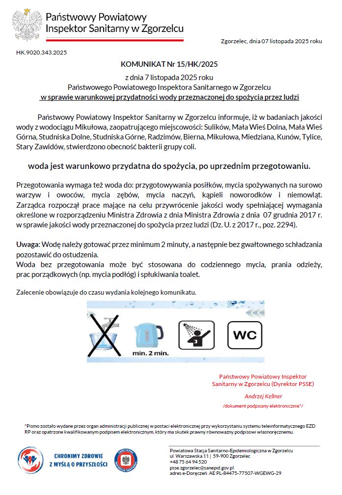 Państwowy Powiatowy Inspektor Sanitarny w Zgorzelcu poinformował, że w badaniach jakości wody z wodociągu Mikułowa, zaopatrującego miejscowości: Sulików, Mała Wieś Dolna, Mała Wieś Górna, Studniska Dolne, Studniska Górne, Radzimów, Bierna, Mikułowa, Miedziana, Kunów, Tylice i Stary Zawidów, stwierdzono obecność bakterii z grupy coli.