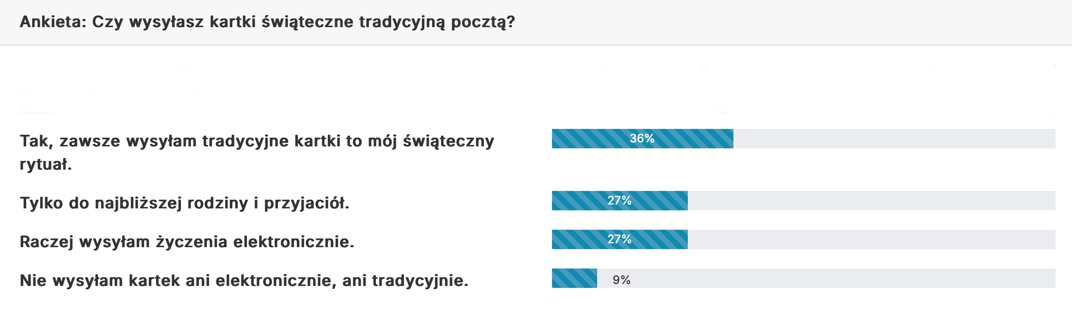 Najwięcej głosów - 36% – zdobyła odpowiedź: „Tak, zawsze wysyłam tradycyjne kartki, to mój świąteczny rytuał.” To pokazuje, że dla wielu osób papierowa kartka pozostaje symbolem świątecznego ciepła i osobistego gestu.