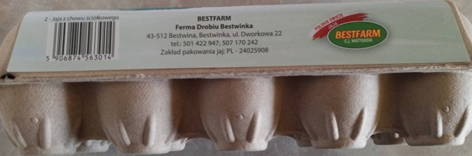Producent: BESTFARM Ferma Drobiu Bestwinka - Janusz Matyjasik, ul. Dworkowa 22, 43-512 Bestwinka, Zakład pakowania jaj: PL-24025908
