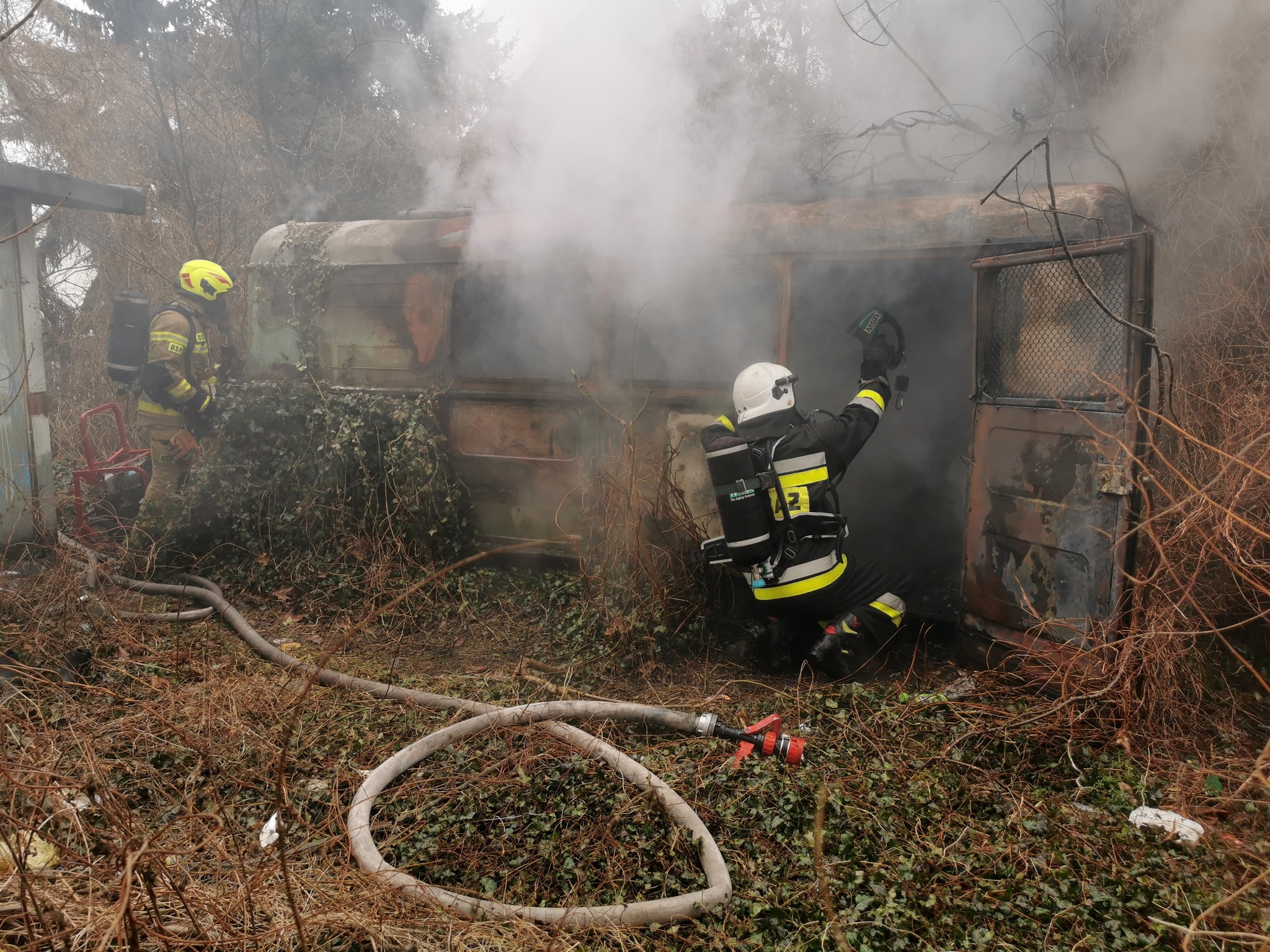 Po przybyciu na miejsce strażacy zastali rozwinięty pożar opuszczonej przyczepy typu barakowóz. Ogień stwarzał realne zagrożenie dla pobliskich zabudowań gospodarczych oraz mieszkalnych. Po zabezpieczeniu terenu działań ratownicy podali dwa prądy wody - jeden w natarciu bezpośrednio na źródło pożaru, drugi w obronie sąsiednich obiektów. Sytuacja była na bieżąco monitorowana przy użyciu kamery termowizyjnej.